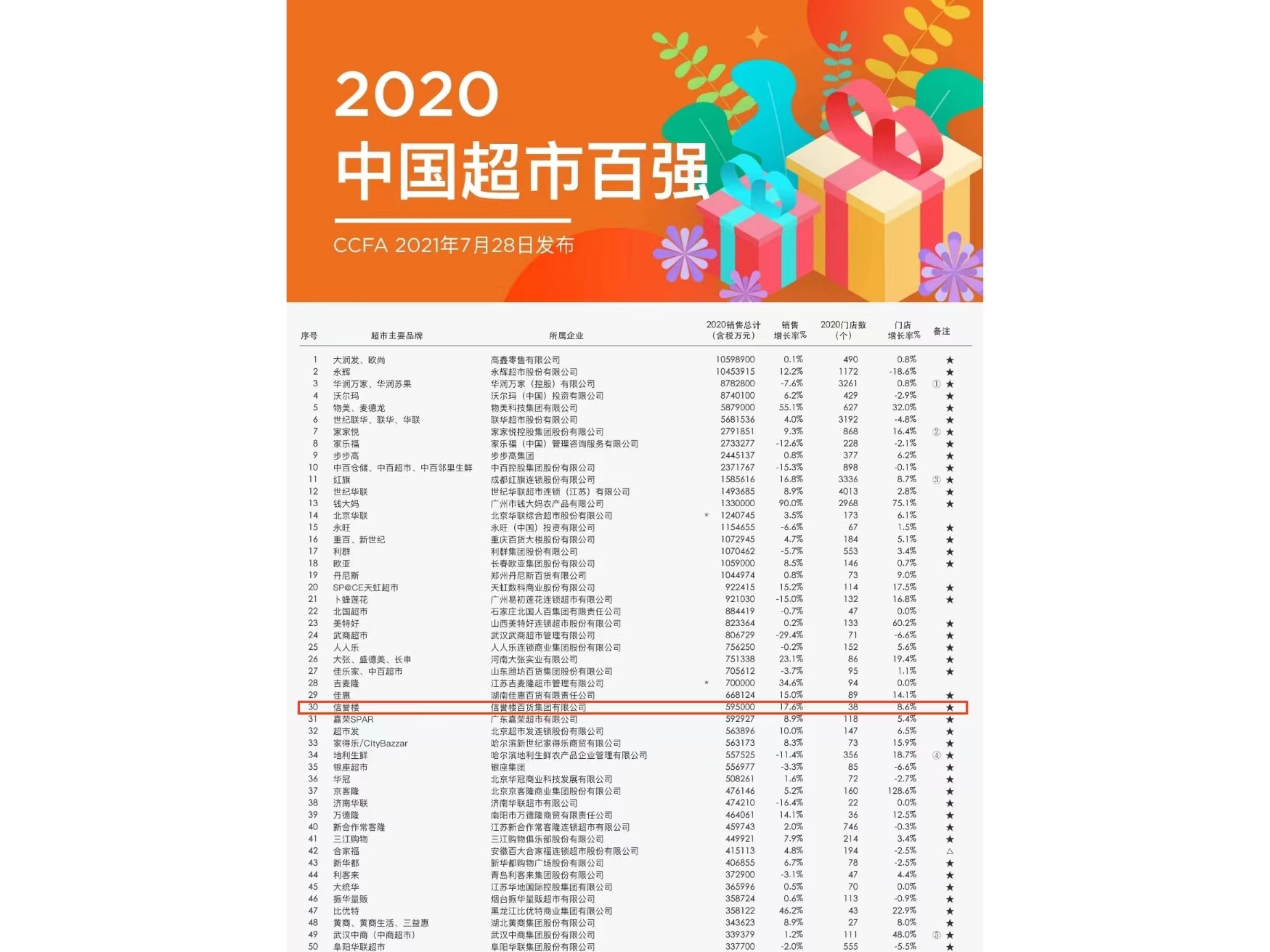 中國超市百強第30位